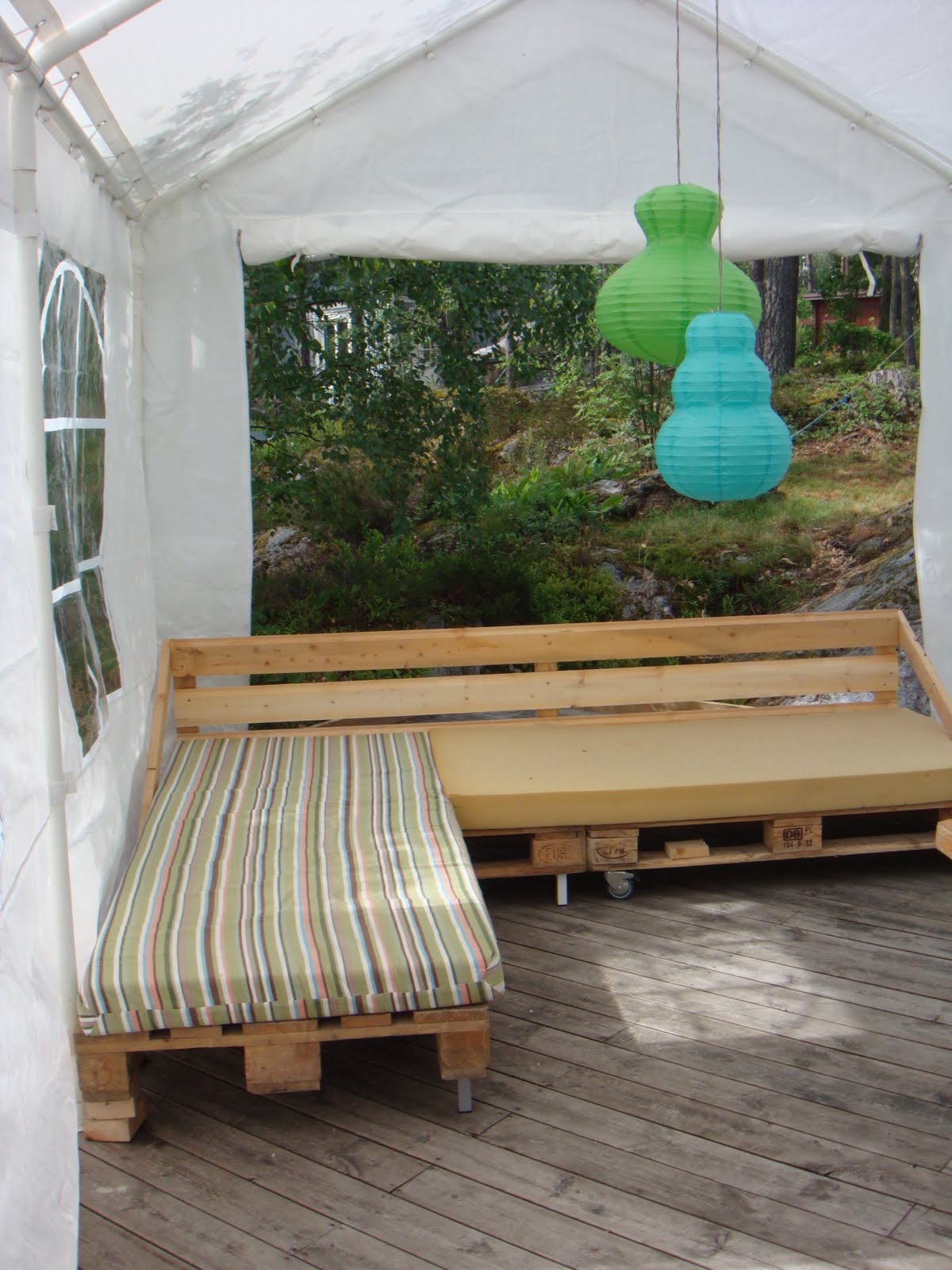 Mina lastpallar är på väg hem nu, ett par frågor bara om det skulle gå för sig? Dock fanns inga mindre för ryggstö så det fick bli lika stora. Lastpallar till soffa och kabeltrumma till bord. Att göra en soffa av lastpallar är väldigt enkelt.