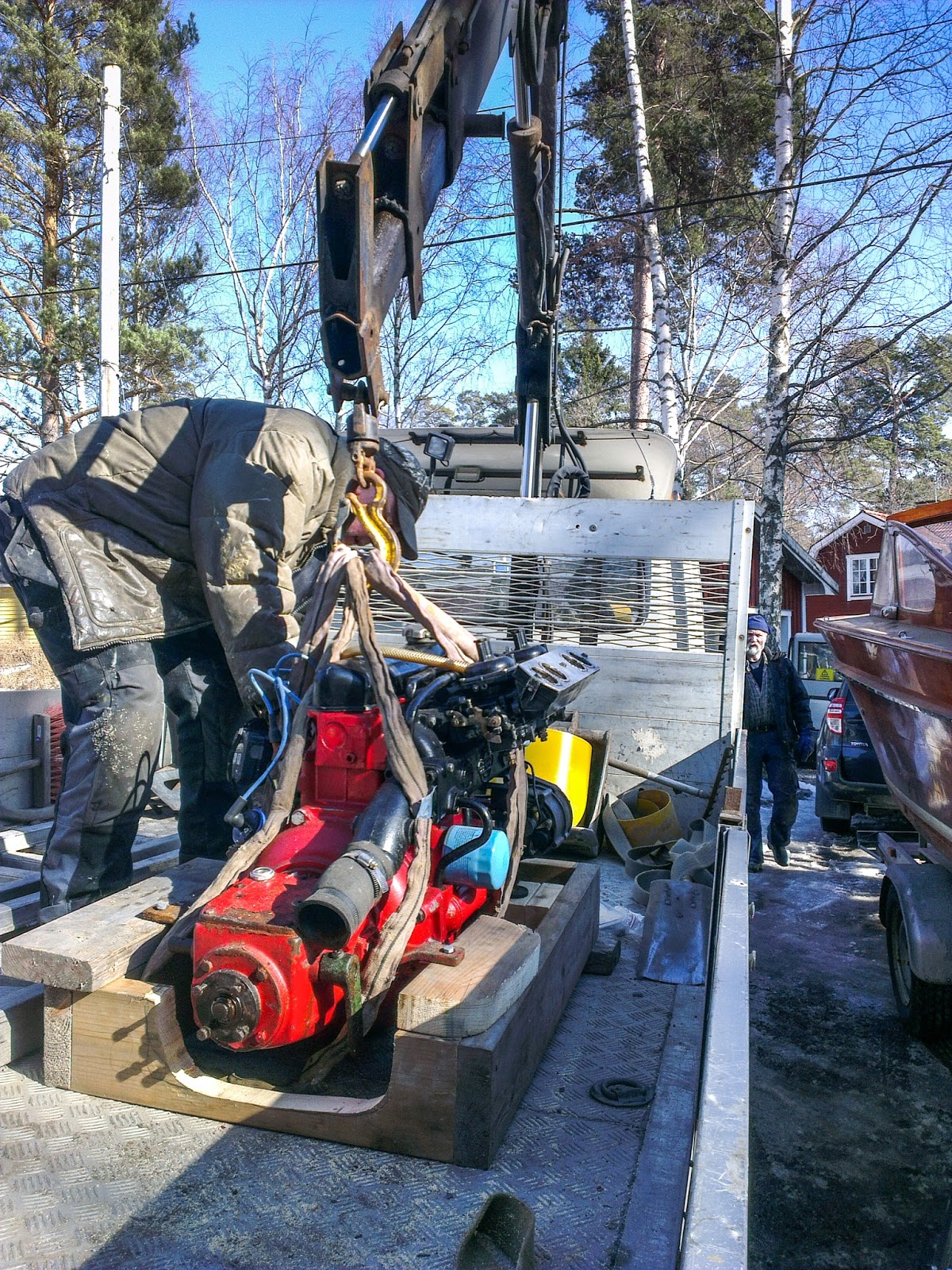 Sen var det bara att knuffa motorn till aktern av båten. Bukh DVNu återstår bara att lyfta motorn ur båten och sen köra runt lite kylarvätska så . Gäller framförallt de elkablar som är anslutna mellan båt och motor. Nu har vi en bra motorlyft avsedd för utombordare. Medlem med båt i Källhagen ska gå vaktpass och medlem med båt på Hundudden ska gå vaktpass.